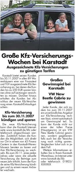 ... das nutzte Karstadt-Quelle für seine Autoversicherungstarife. Ein Beratungstext mit Preisausschreiben sorgte für die nötige Aufmerksamkeit der Verbraucher.