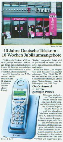 Die Telekom feierte im Sommer 2005 ihr 10jähriges Bestehen mit 10 Wochen voller Sonderangebote und Aktionen im T-Punkt. Unsere Aufgabe war es, die Aktionswochen mit Materndiensten zu begleiten und so den Abverkauf der jeweils wöchentlich angeboteten Sonderangebote zu unterstützen.